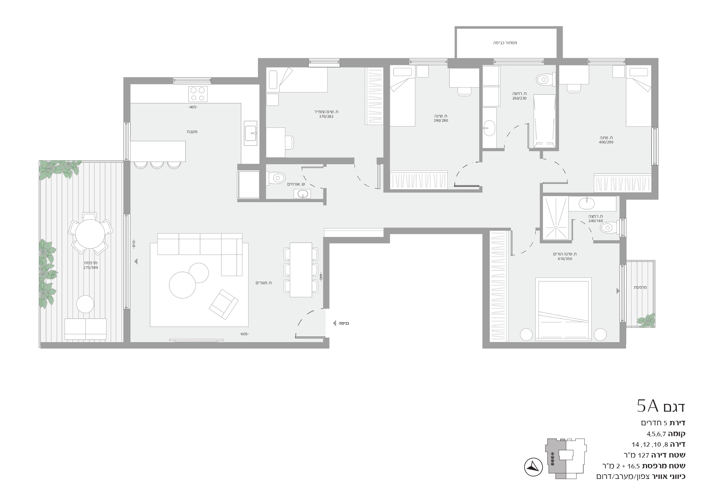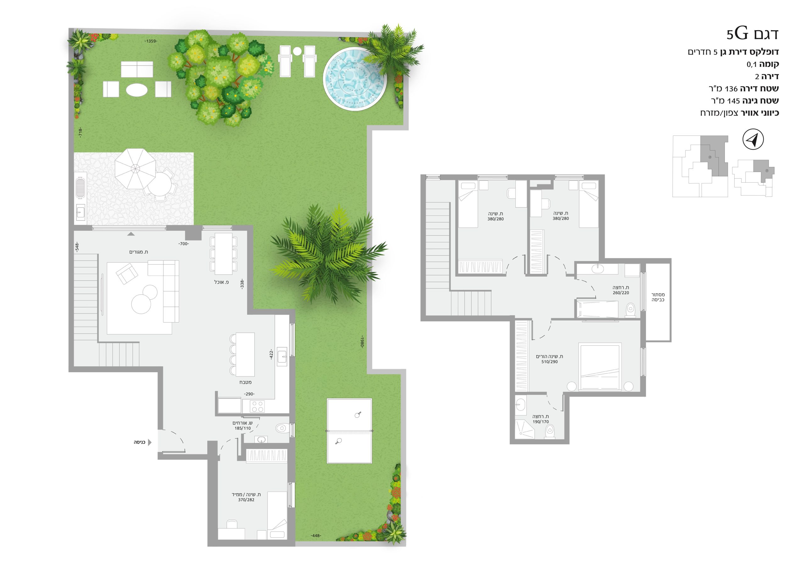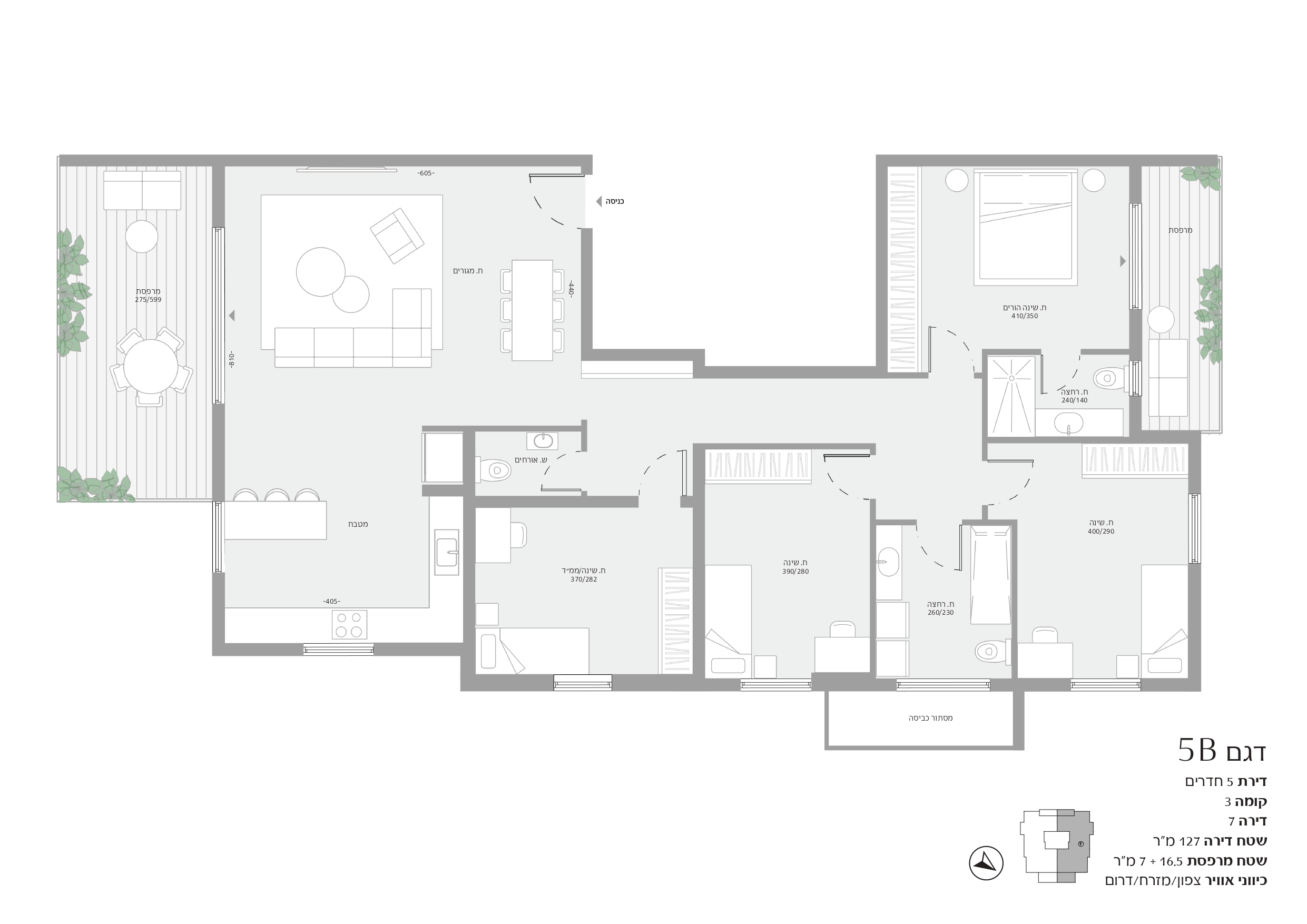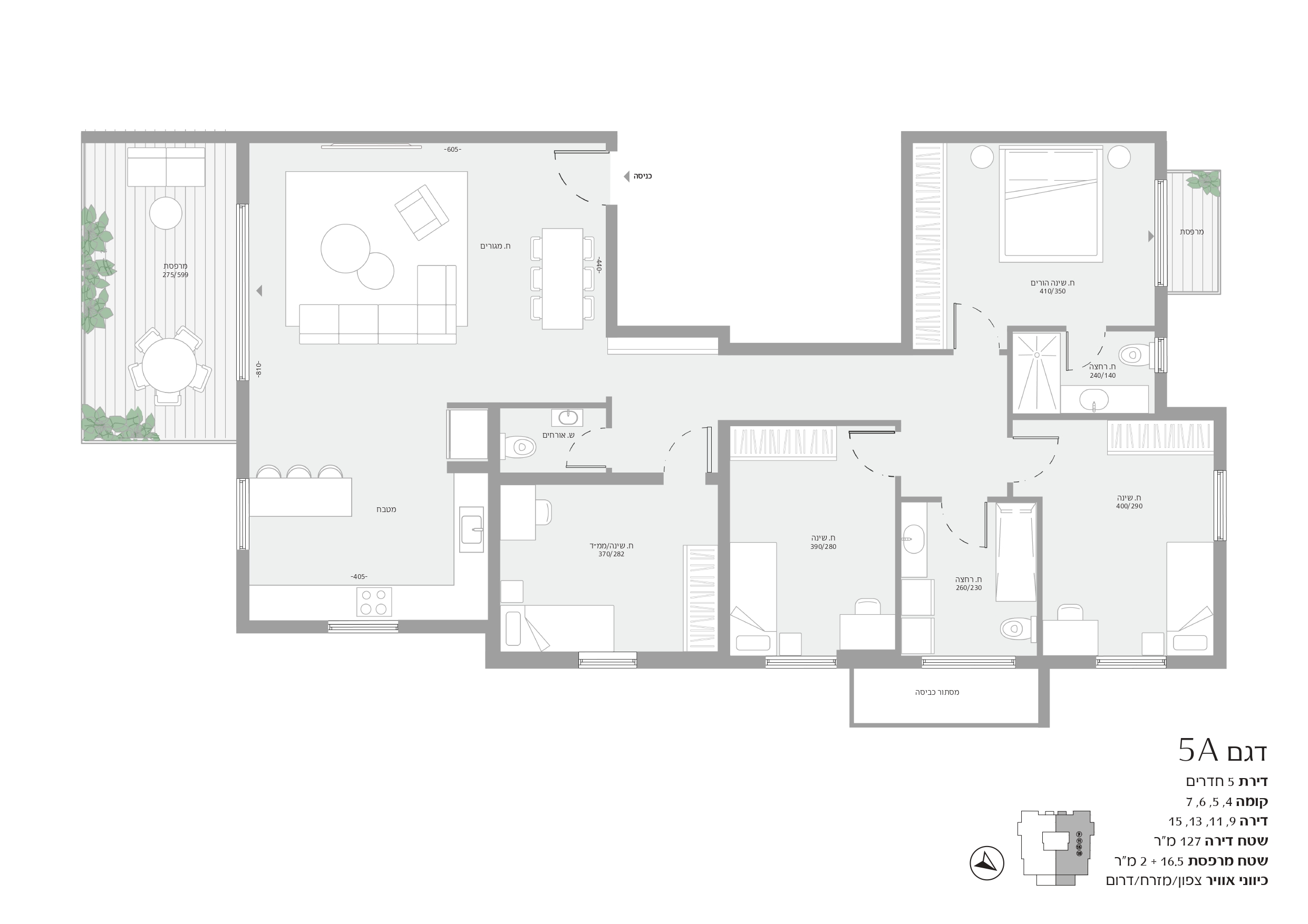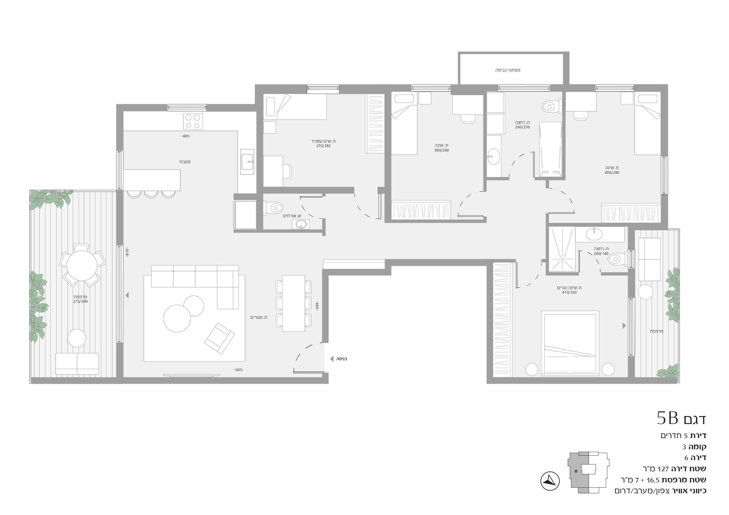 דירות 3 ו-5 חדרים עם מרפסות שמש רחבות, דירות גן 5 חדרים עם גינות גדולות, ופנטהאוזים בני 5-6 חדרים שכל אחד בקומה משלו.