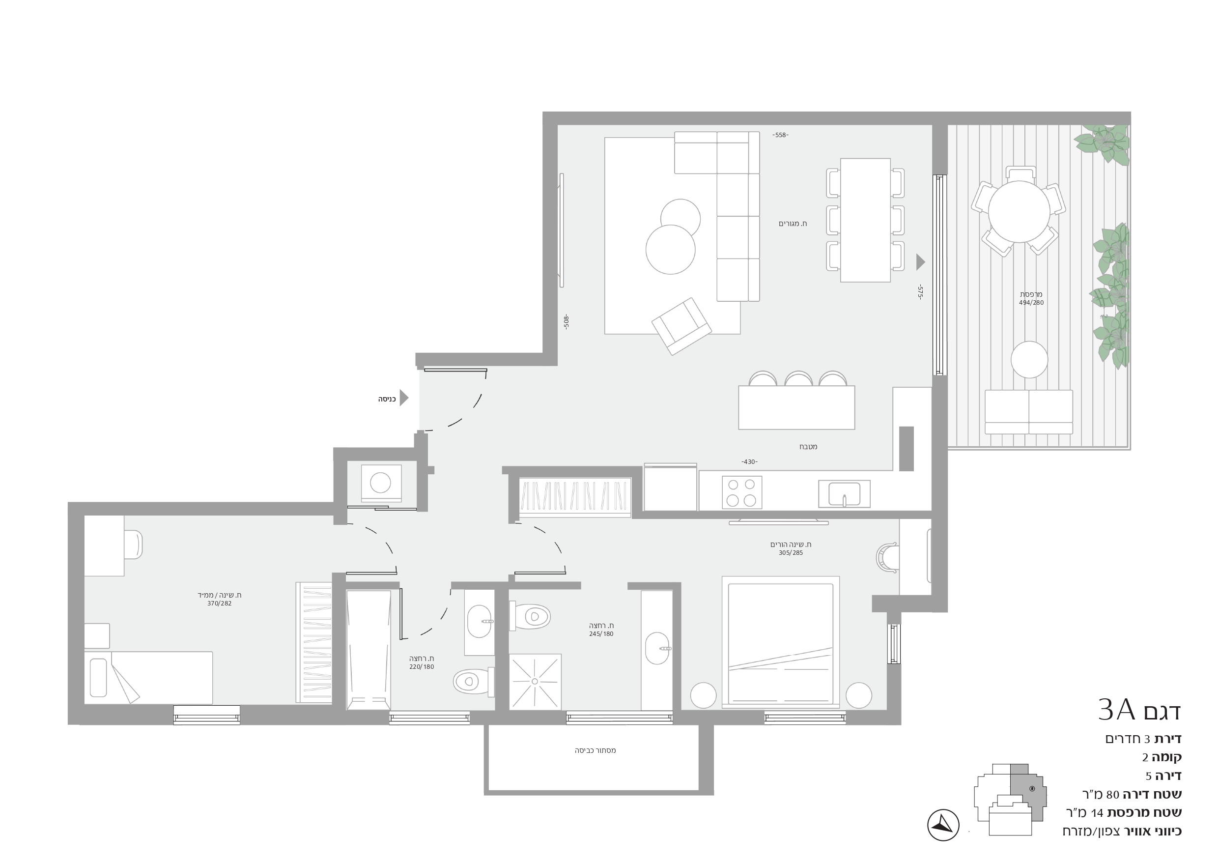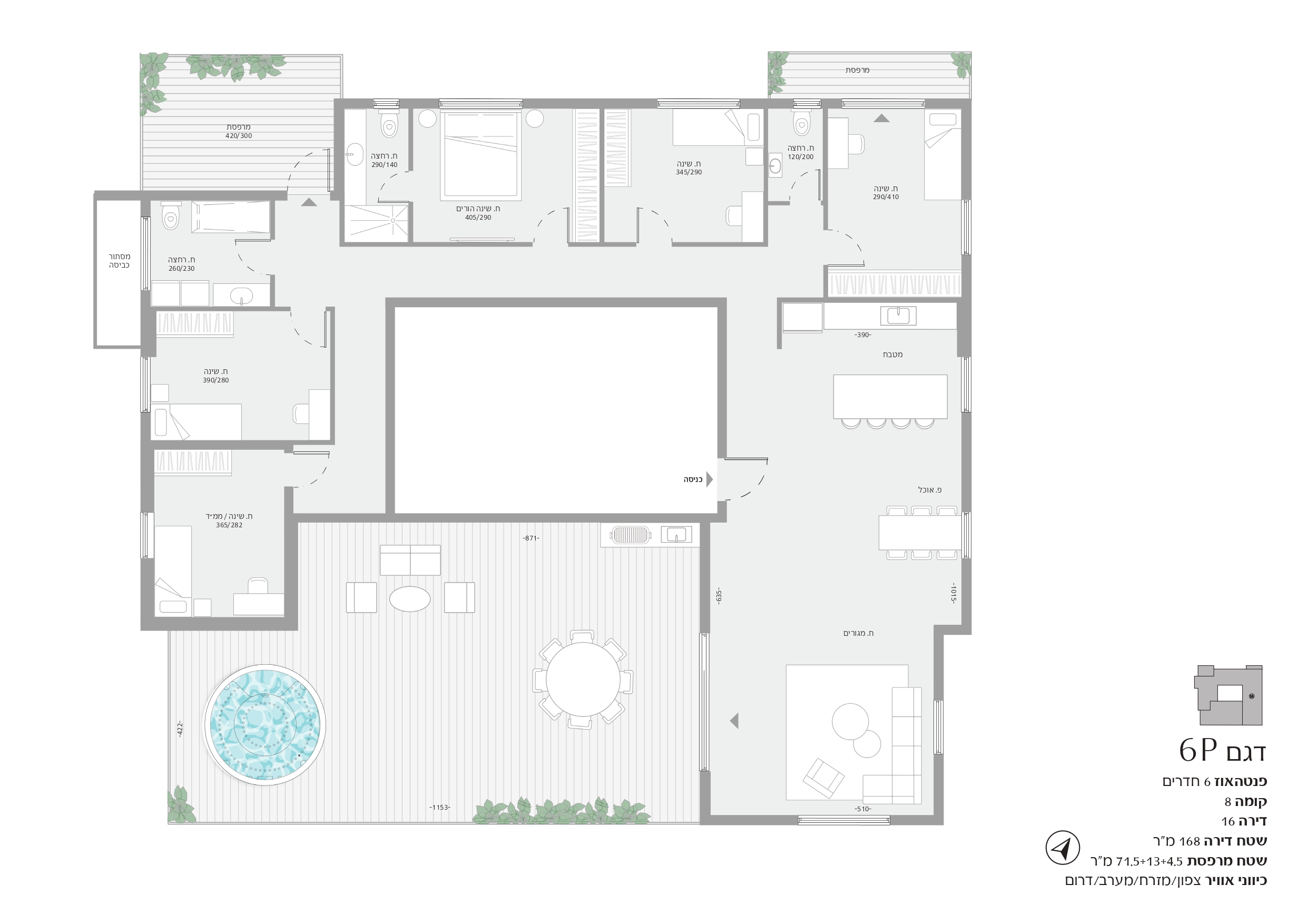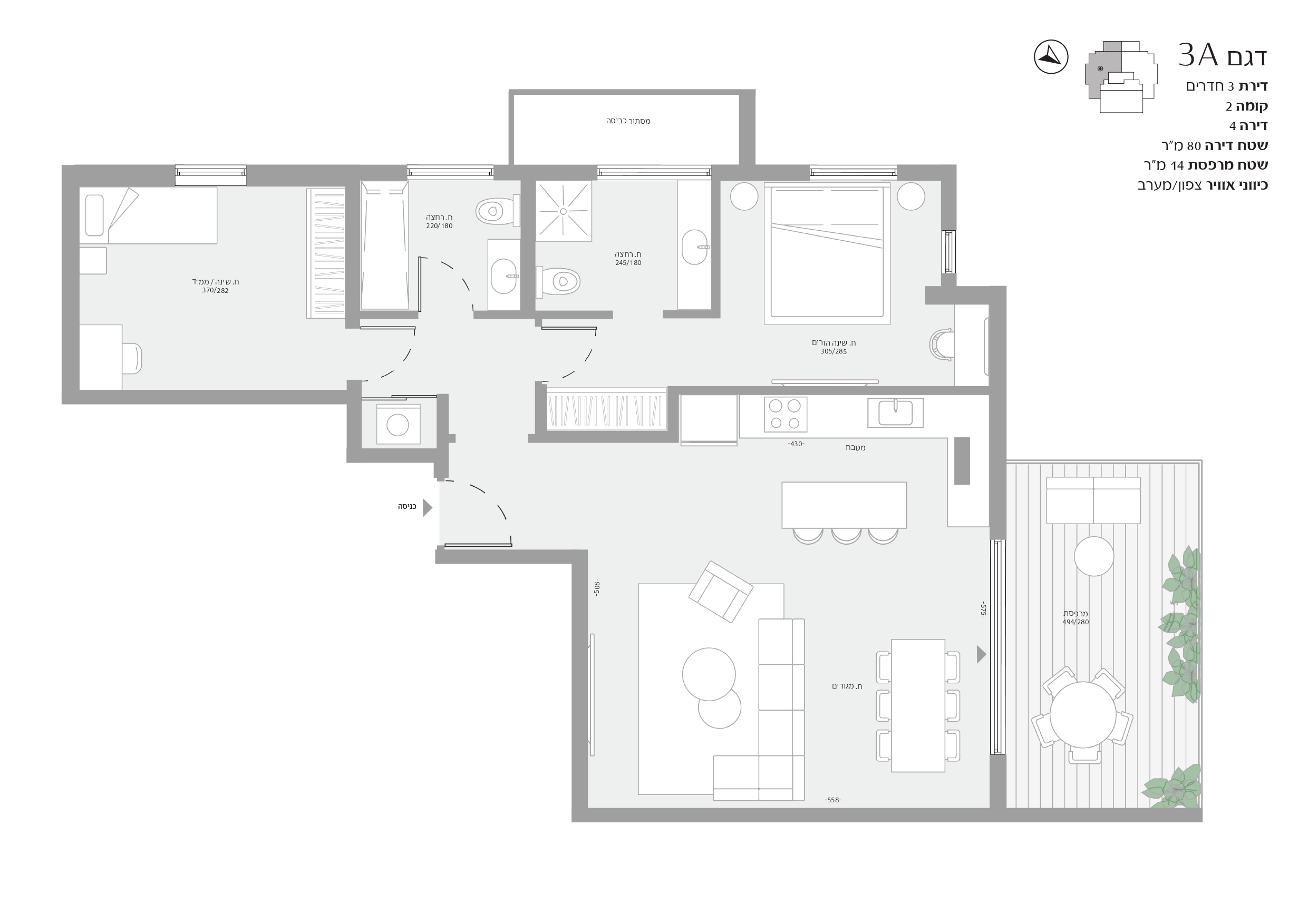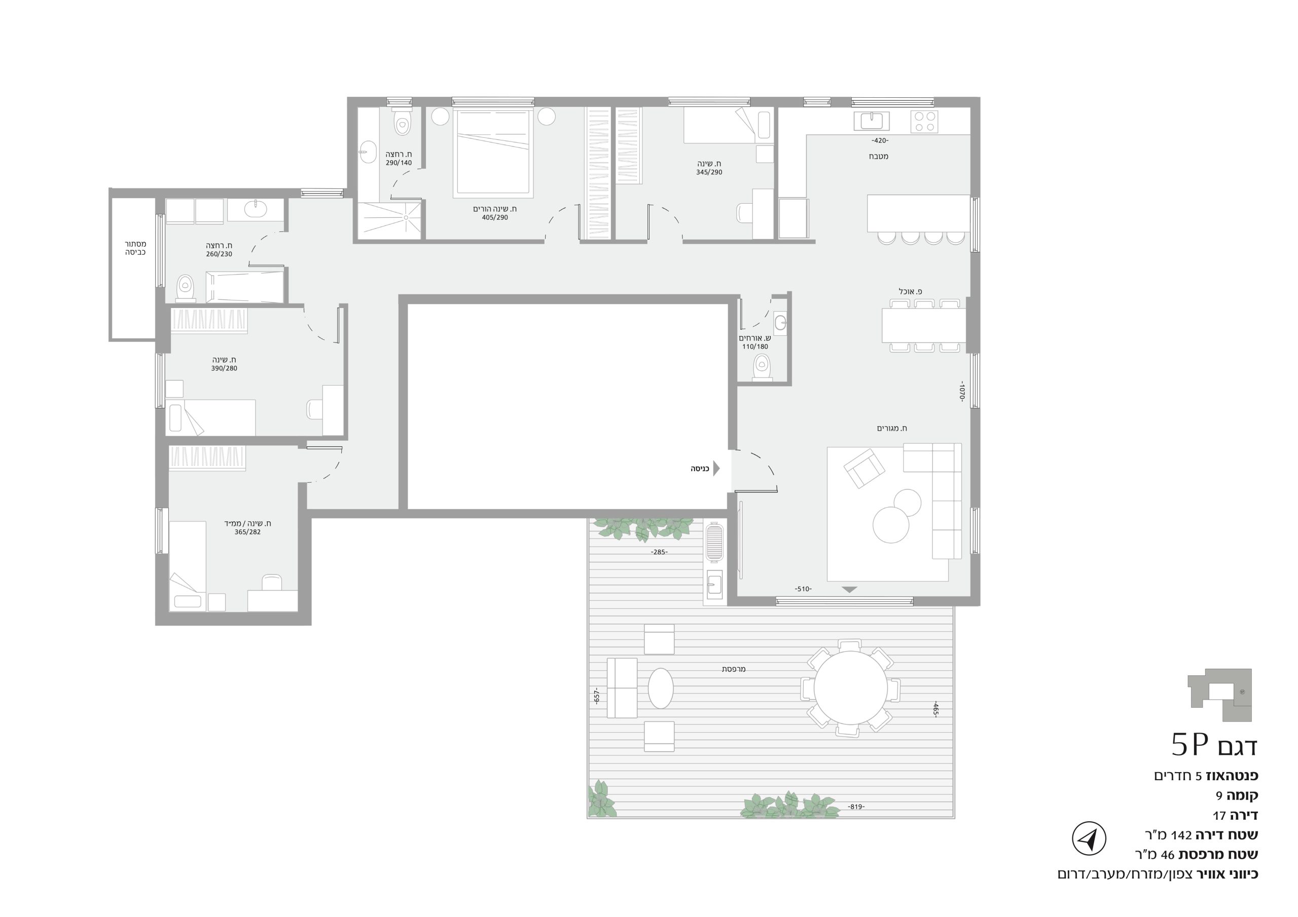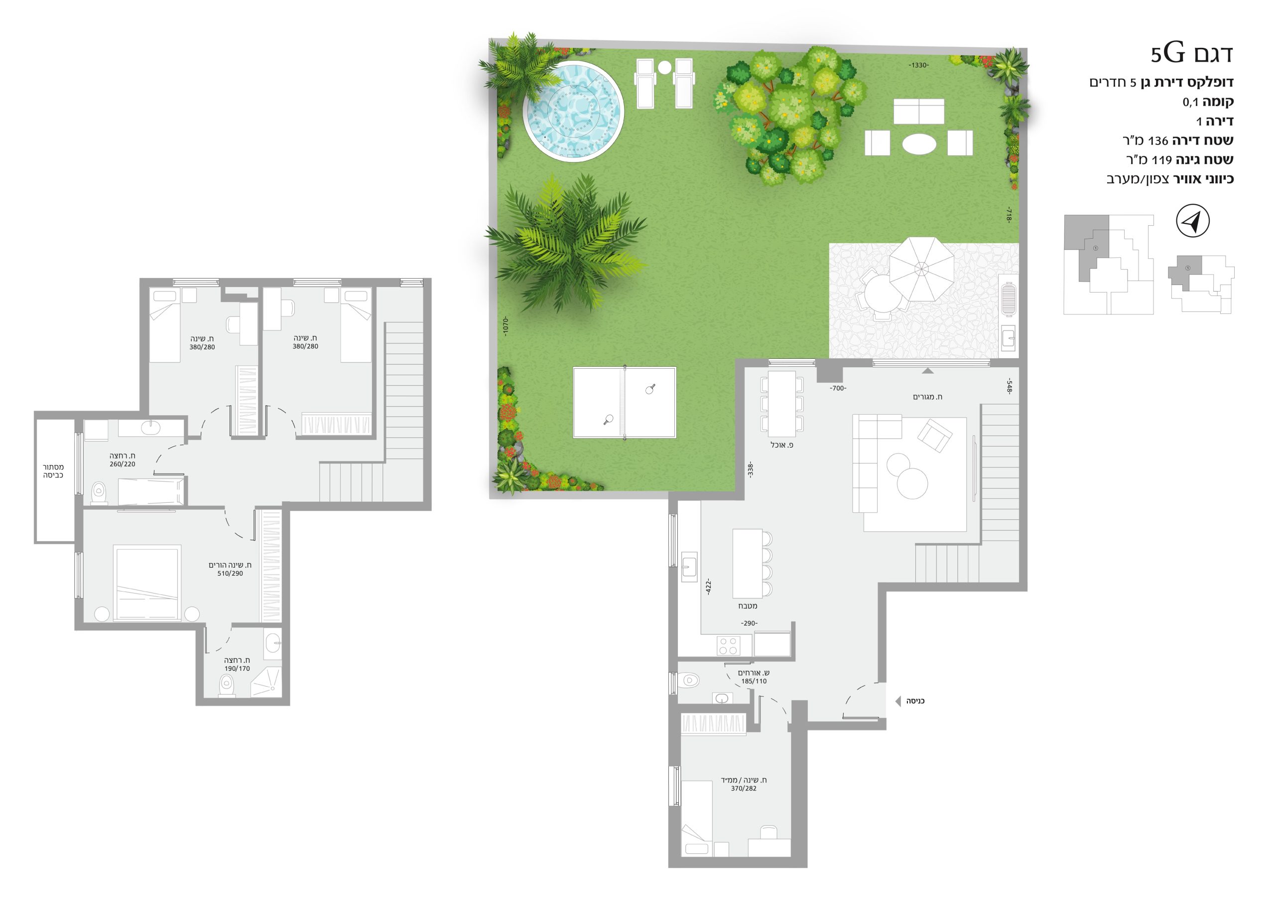 דירות 3 ו-5 חדרים עם מרפסות שמש רחבות, דירות גן 5 חדרים עם גינות גדולות, ופנטהאוזים בני 5-6 חדרים שכל אחד בקומה משלו.